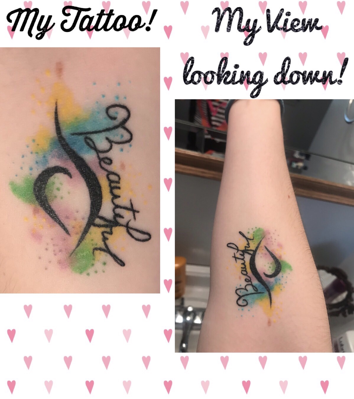 P.S. here is that photo of me in a bikini that kick started my true self love for myself and my body (this is the photo I have as my screensaver, that I added loving words to as well to be reminded everyday) and knowing that Victoria secret body’s are false advertising and seeing your bones is not healthy. Also here is a photo of my tattoo of triumph and recovery and beauty!! (each color has a meaning, the word, writing and style as well all have purpose!)
